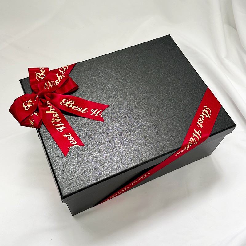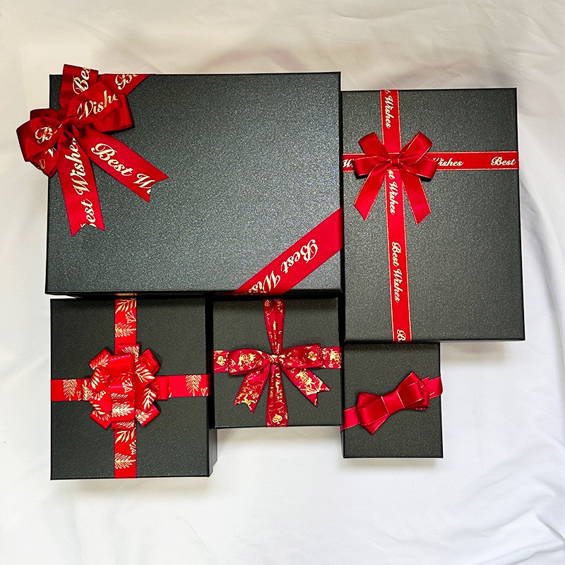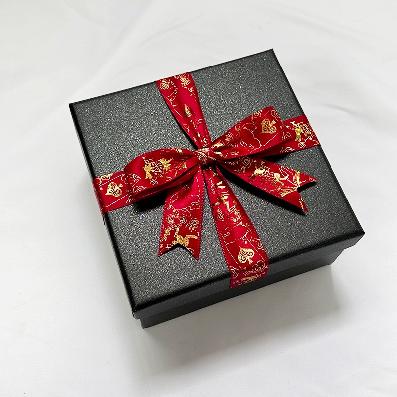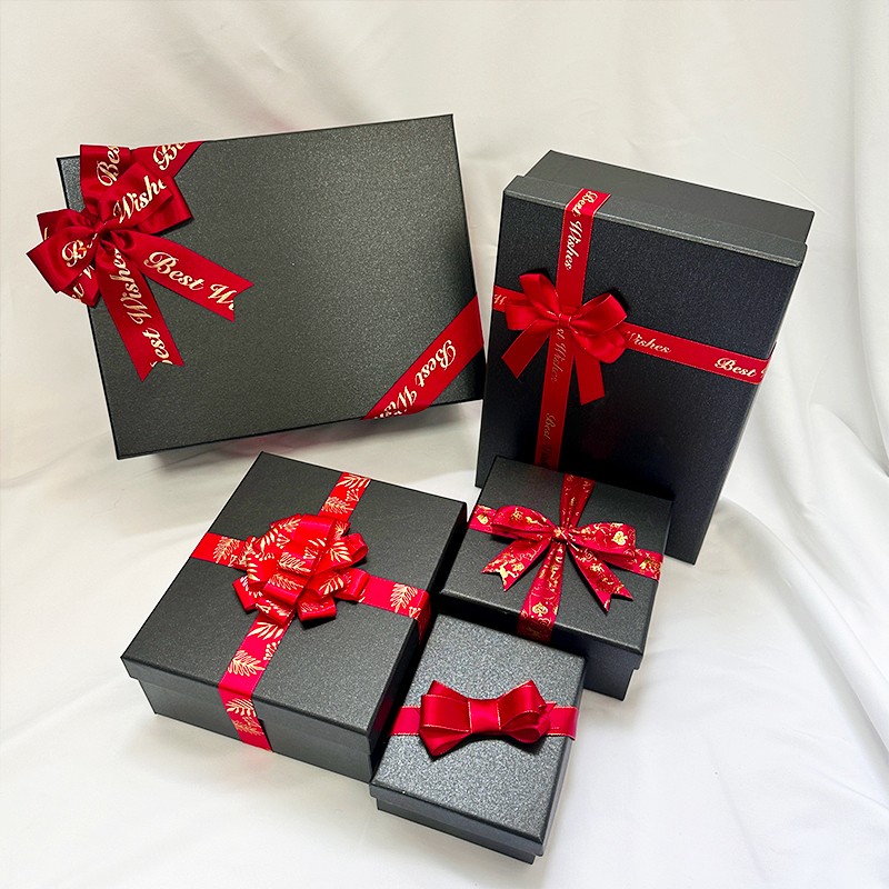 Paired with sleek matte black gift boxes, the vibrant red satin ribbon creates a striking visual contrast that exudes sophistication. The ribbon can feature gold-foil "Best Wishes" messaging or holiday patterns (like pine branches, reindeer), and the full, three-dimensional bow fits boxes of all sizes while instantly boosting the packaging’s luxury and festive charm.