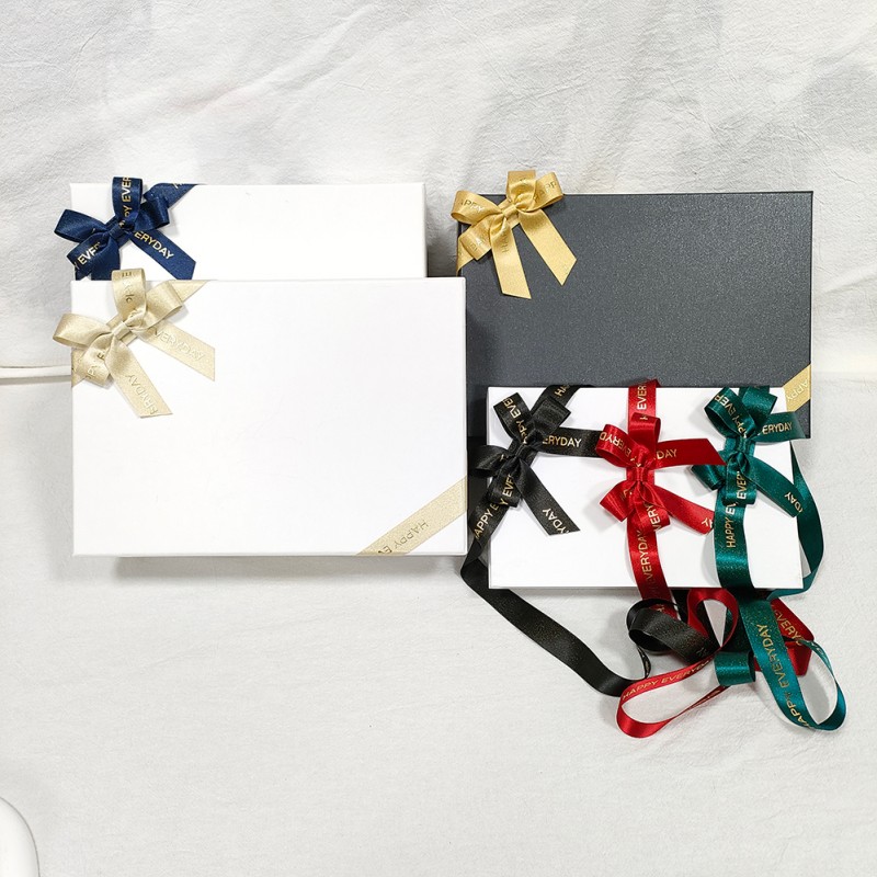 Paired with white/black gift boxes, these bows feature multi-hue glitter-gold satin ribbon (navy, gold, black, red, dark green) to suit diverse aesthetics. The ribbon has subtle glittery texture, and the "HAPPY EVERYDAY" gold-foil lettering is crisp and eye-catching. The neat, full bow instantly elevates packaging—whether paired with a minimalist white box or a luxe black box.