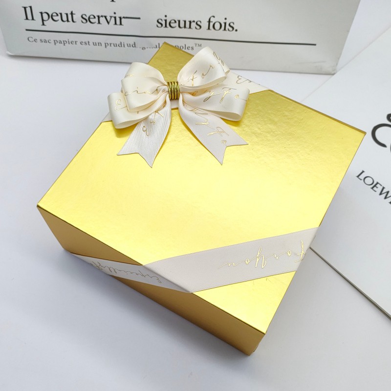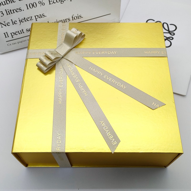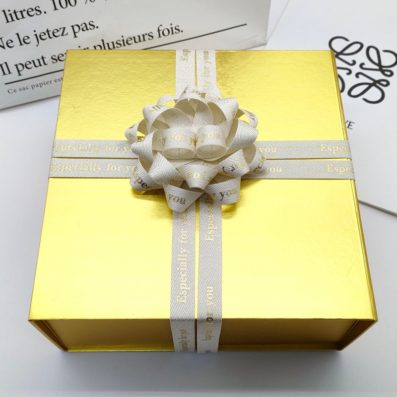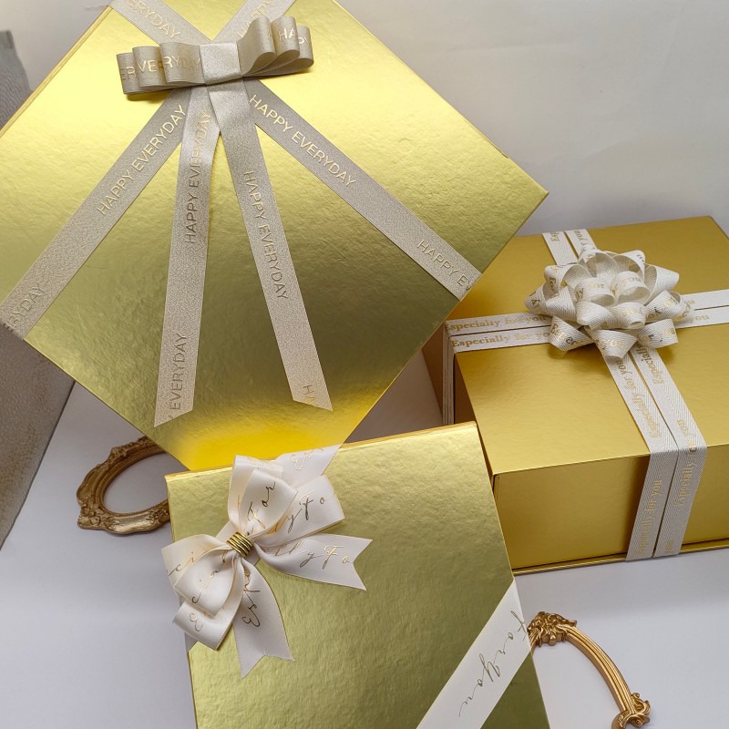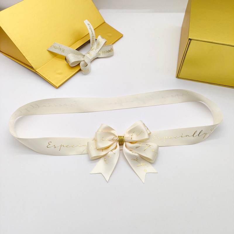 Paired with gilded gift boxes, these bows feature satin ribbon + gold-foil text — cream ribbon creates a soft contrast with gilded packaging, and phrases like “HAPPY EVERYDAY” or “Especially for you” add delicate warmth. Choose between full large bows or minimalist small knots to fit boxes of all sizes, instantly elevating packaging with an “understated luxury” vibe.